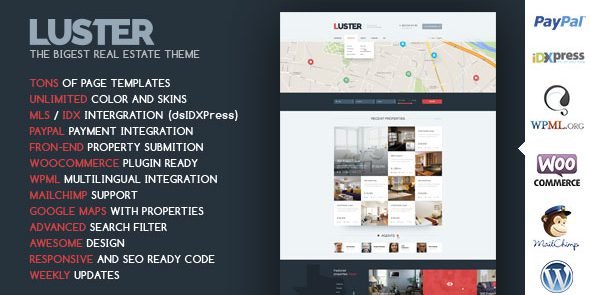 Luster – 是最大的房地产主题在我们这个时代。它配备了吨页面模板和自定义选项。这个主题是为您的企业的最佳解决方案。首先主题是dsIDXpress准备就绪,可以完美的MLS / IDX整合。其次,你可以使用名为«性质»创建个人房源的自定义职位类型,有很多自定义选项。而且,还可以启用承认你的访问者发表个人财产的选项。