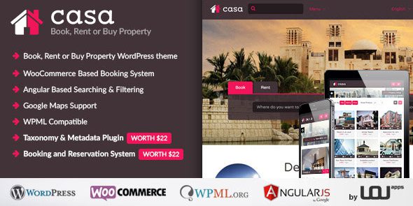 CASA是房地产WordPress主题,提供了多种选项来创建属性和上市的其他电子商务相关的产品/服务。